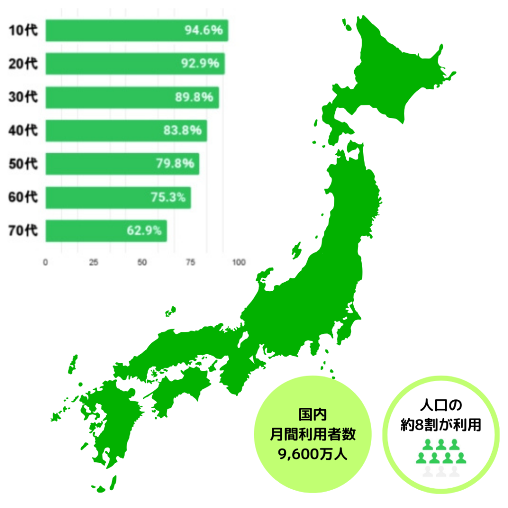 国内の月間アクティブユーザー数9,600万人。日本の人口の約8割以上が利用しています。